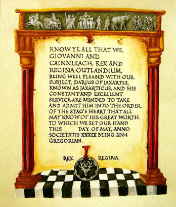 Scroll by Averil duBois d'Avignon to commemorate [[[Darius of Jaxartes]] induction into the order of the Stag's Heart