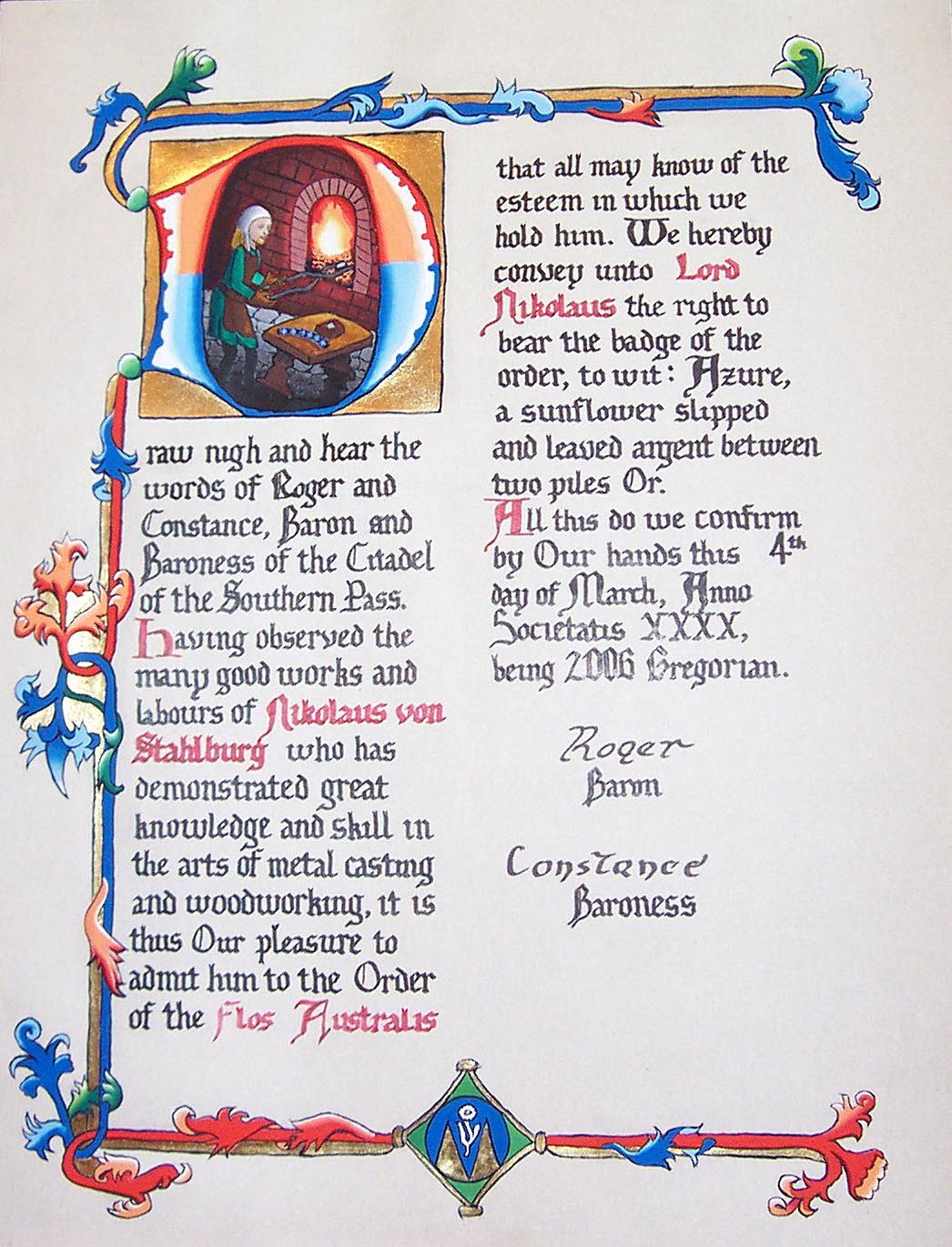 The scroll commemorating Nikolaus von Stahlberg admittance to the Order of the Flos Australis. Created by Aine inghean Cormac.