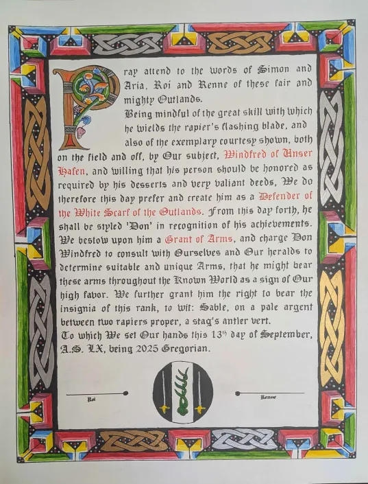 [[White Scarf of the Outlands]] scroll for [[Windfred (of Unser Hafen)]]. Illumination by [[Kökechin Qo'a]] and calligraphy by [[Eoghan MacIver|Eoghan MacIver.]]