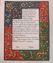 | 13:40, 23 September 2025 | Michaelmcquillan-argenthart.jpg (file) | 61 KB | The scroll commemorating Michael Mcquillan's induction into the Order of the Argent Hart. Done by Aine inghean Cormac. | 1 | |