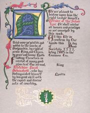 | 13:27, 23 September 2025 | Nikolausvonstahlburg-flosaustralis.jpg (file) | 261 KB | The scroll commemorating Nikolaus von Stahlberg admittance to the Order of the Flos Australis. Created by Aine inghean Cormac. | 1 | |