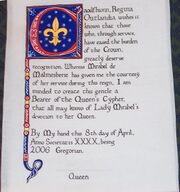 | 13:21, 23 September 2025 | Mirabeldemalmesberie-queenscypher.jpg (file) | 78 KB | The scroll commemorating Mirabel de Malmesberie's receipt of the Queen's Cypher. Created by Aine inghean Cormac. | 1 | |