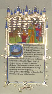| 07:13, 24 September 2025 | Harailt-bahiyyah-legionofgallantry.jpg (file) | 2.18 MB | Scroll by Bahiyyah bint Suhayl to commemorate Harailt of Dinsmoor's induction into the Legion of Gallantry | 1 | |