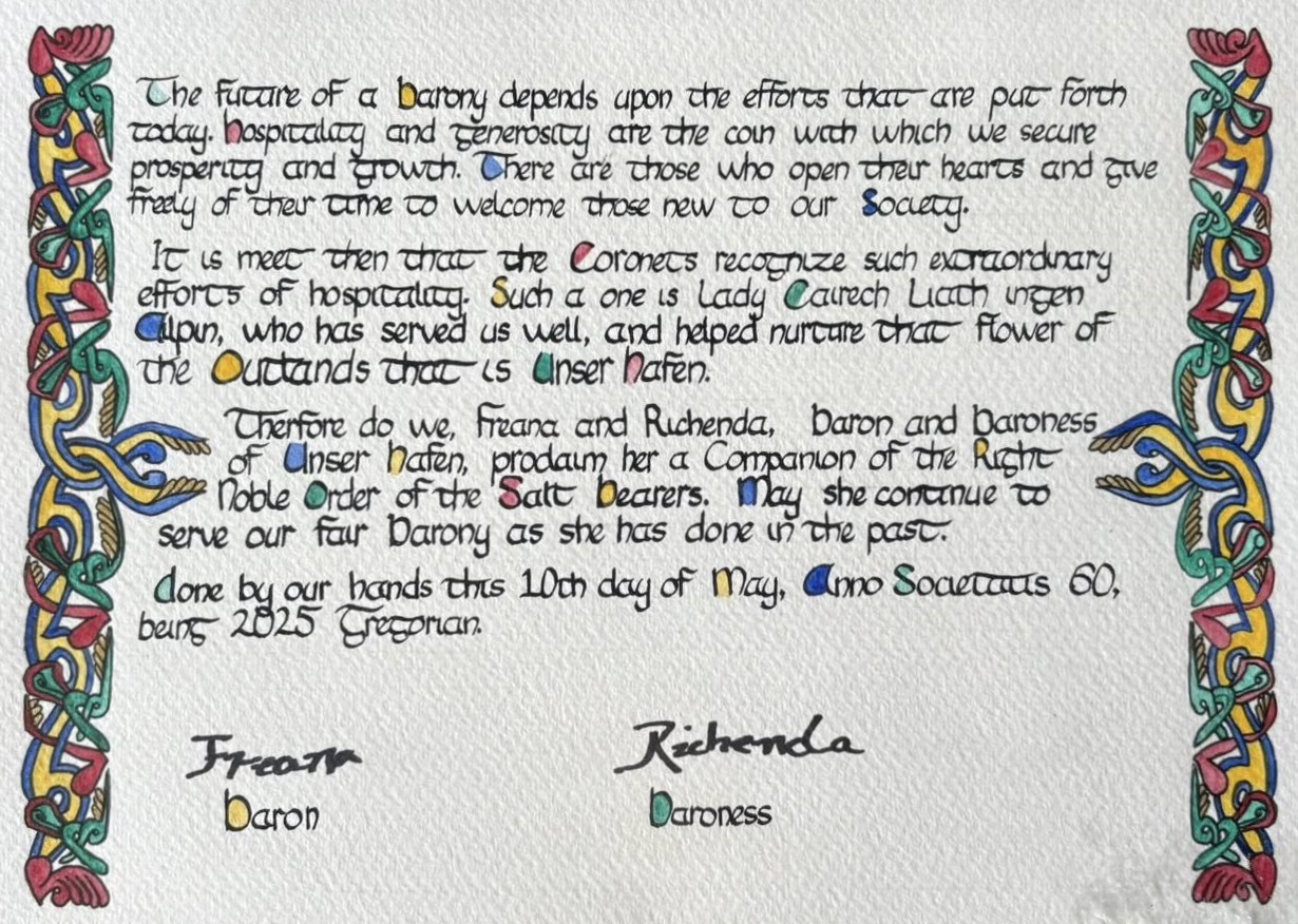 | current | 09:06, 23 October 2025 | 1,230 × 876 (351 KB) | Evpraksiia (talk | contribs) | Salt Bearer of Unser Hafen scroll by Lewena de Galwedia |